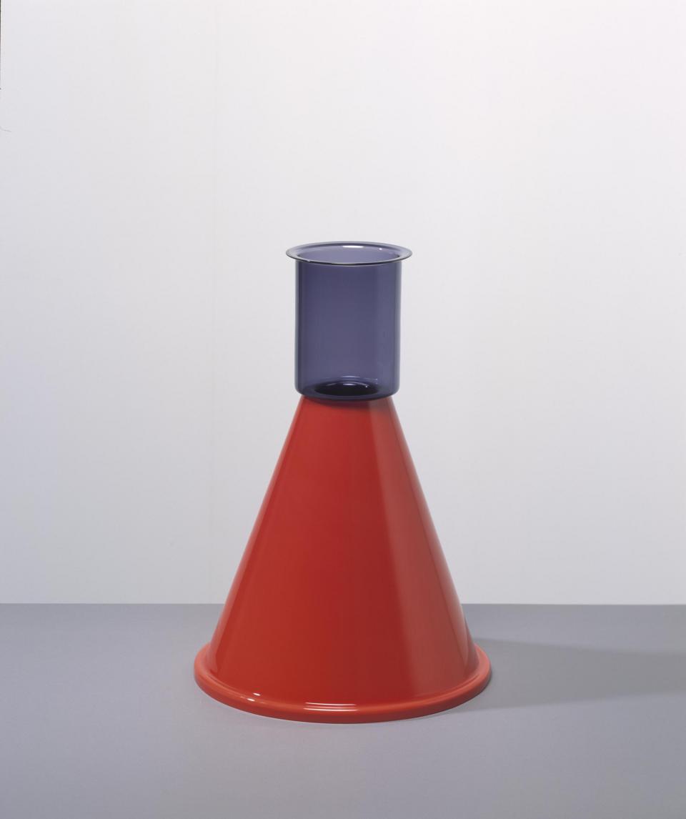 Goburam Rosso, vase en verre de la collection d’Ettore Sottsass pour Venini, a été créé en 2001. Ce vase soufflé à la bouche se compose d’une base en forme de cône tronqué de couleur rouge corail opaque, surplombé d’un cylindre de verre bleu minuit transparent.