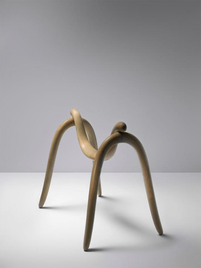 Swing est un siège en érable traité au sulfate de fer qui évoque la balançoire de notre enfance. Le design de cet objet combine une sensation de gravité avec le besoin de créer un équilibre. Aldo Bakker s’inscrit dans une démarche à l’encontre des conventions actuelles où la forme prime sur la fonctionnalité. Son design s’inspire avant tout de la forme qu’il développe, combine, questionne jusqu’à aboutir à une fonction, conduisant, ainsi, à la création d’objets innovants. Cette façon de procéder, durant la conception, induit une gestuelle, une manipulation nouvelle, autour de l’objet en question. Modifiant, dès lors, ces actes occasionnels et quotidiens, il confère à l’objet une attention et une concentration particulières.