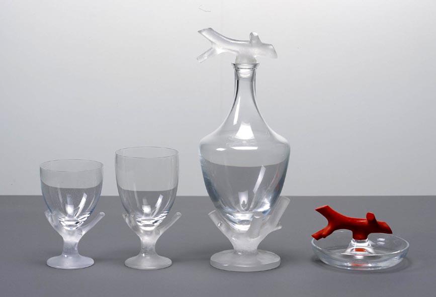Carafe de 28.00 cm de haut et 12.00 cm de diamètre. Bouchon de 11cm de haut et 7 cm de large. 6 verres de 15.50 cm de haut et 8.8 cm de diamètre. La carafe et les coupes des verres sont en cristal, les pieds et le bouchon de carafe sont en pâte de verre, évoquant des branchages.