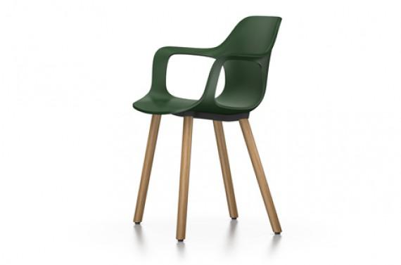 Hal est une chaise avec accoudoirs et piétement en chêne massif foncé avec vernis de protection. La coque d'assise en polypropylène est de couleur lierre. Le piétement est posé sur des patins en feutre pour sol dur.