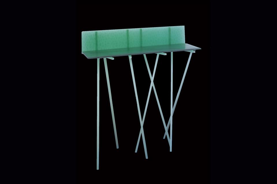 Tentokuin est une console en métal peint et tablette de verre.