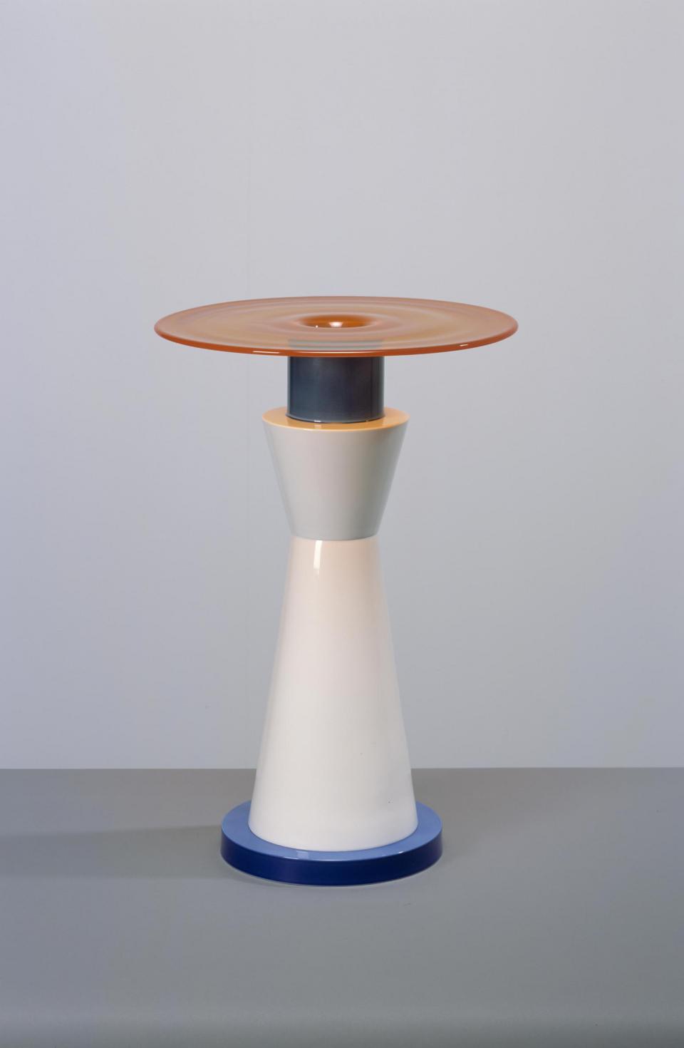 Entre 1993 et 2006, le designer italien Ettore Sottsass a créé pour Sèvres, 20 formes inédites : 19 vases colorés et 1 surtout de table blanc et or. Les créations portent des noms souvent inspirés de prénoms féminins célèbres (Lolita, Lucrèce, Messaline, Joséphine, Salomé ou Juliette) ou de références tziganes (Cozek, Rababah, Ederceszi…). Ces œuvres - véritables petites architectures de table qui détiennent chacune la préciosité des savoir-faire hérités du XVIIIe siècle et la richesse des palettes de couleurs de grand et de petit feu - sont composées de différents éléments géométriques ronds pour la majeure partie d’entre eux, réalisés entièrement à la main à la Manufacture. Ses premières créations de 1993, comme les 5 dernières de 2006, ont été dessinées par Sottsass pour la Manufacture et l'on y retrouve la pureté des formes comme son goût pour les associations de matière et les couleurs subtiles. On peut caractériser la production de la Manufacture nationale de Sèvres, depuis sa création en 1740, par la complexité de son processus de fabrication et de décoration, que ni l’objet fini, lisse et brillant, ni l’origine de sa matière issue des roches et d’une argile, ne révèlent. C’est la combinaison des matières premières et la diversité des savoir-faire, dues à l’ingéniosité de l’homme, qui aboutit à l’objet parfait, sachant qu’il s’agit aujourd’hui du dernier endroit où l’on fabrique encore les pièces de porcelaine de cette manière. C’est aussi probablement ces raisons qui ont attiré le grand designer italien à Sèvres, en 1993 puis de nouveau, avec enthousiasme, en 2005, afin de continuer à enrichir le patrimoine de la Manufacture. Les parties en verre ont été réalisées par Venini.