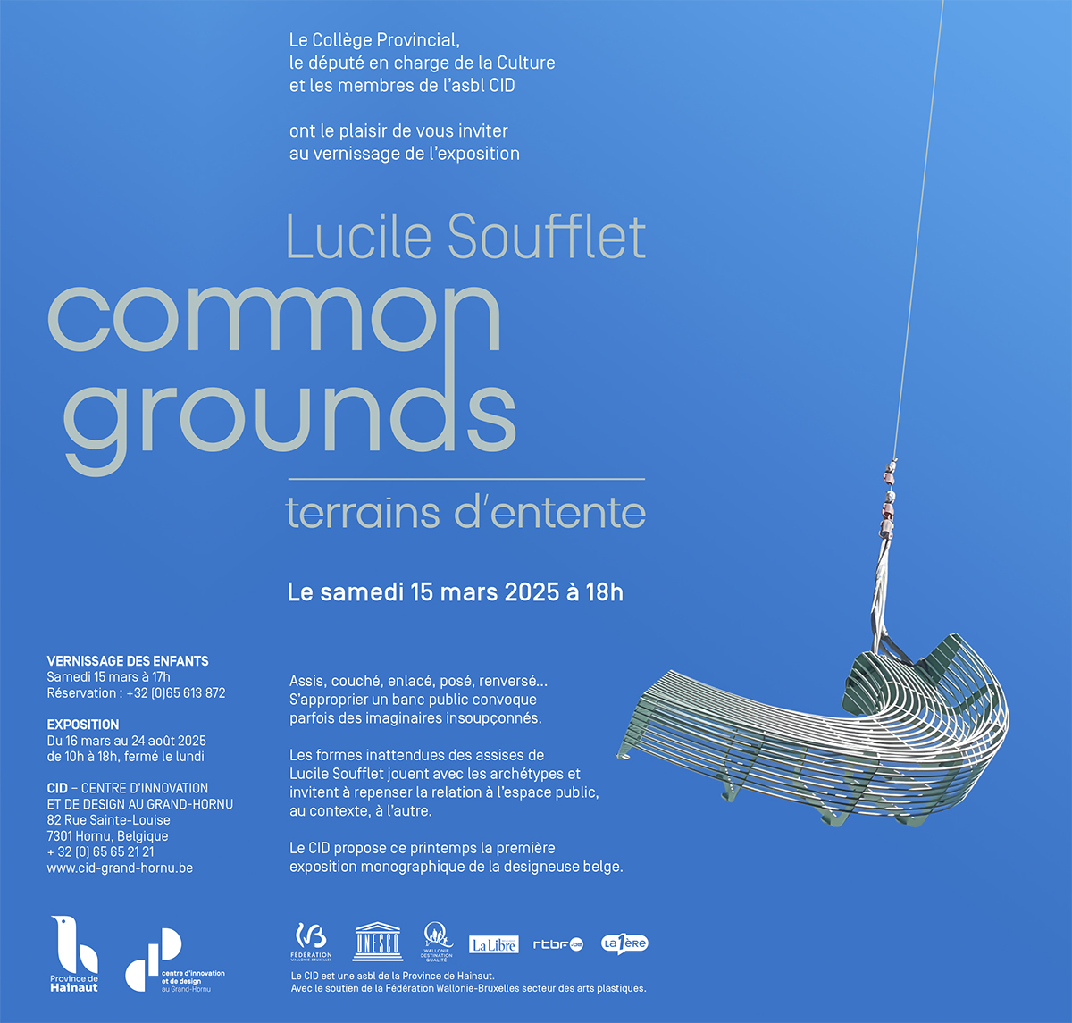 À partir du 16 mars et jusqu'au 24 août, le CID – centre d’innovation et de design au Grand-Hornu présente « Common Grounds », une exposition entièrement dédiée au travail de Lucile Soufflet. Des bancs mais également ses projets de céramique et de verre exprimant la délicatesse qui caractérise, au même titre que la rigueur, la personnalité de Lucile Soufflet.